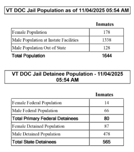 3. ICE detainees: As of this writing, the Department of Corrections is holding 80 federal detainees. While a few of those may not be ICE detainees, it’s safe to assume the great majority of them are. And for those who think that Vermont is a better place for undocumented people than a federal facility, these detainees only spend a few days in our prisons before being transferred to a detention center.